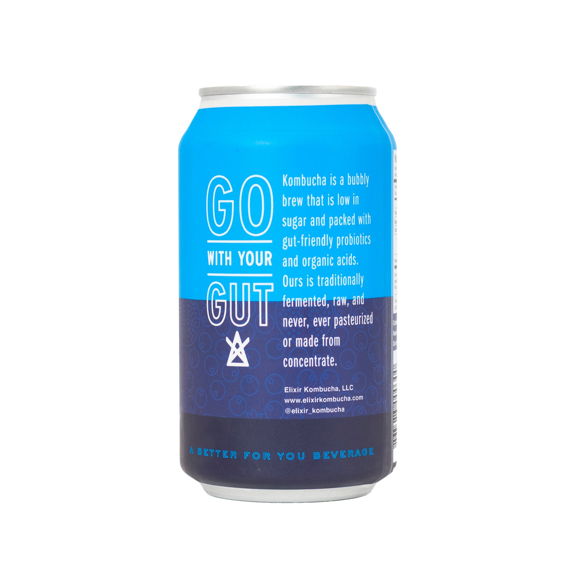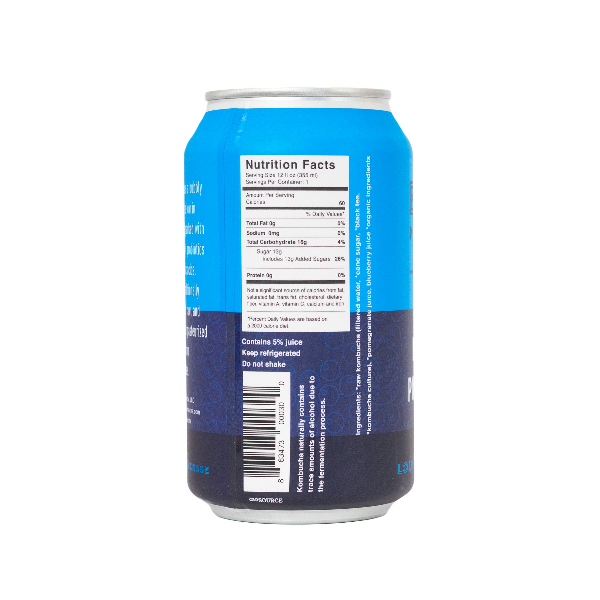 Ingredients: organic raw kombucha (filtered water, organic cane sugar, organic black tea, organic kombucha culture), blueberry juice, pomegranate juice