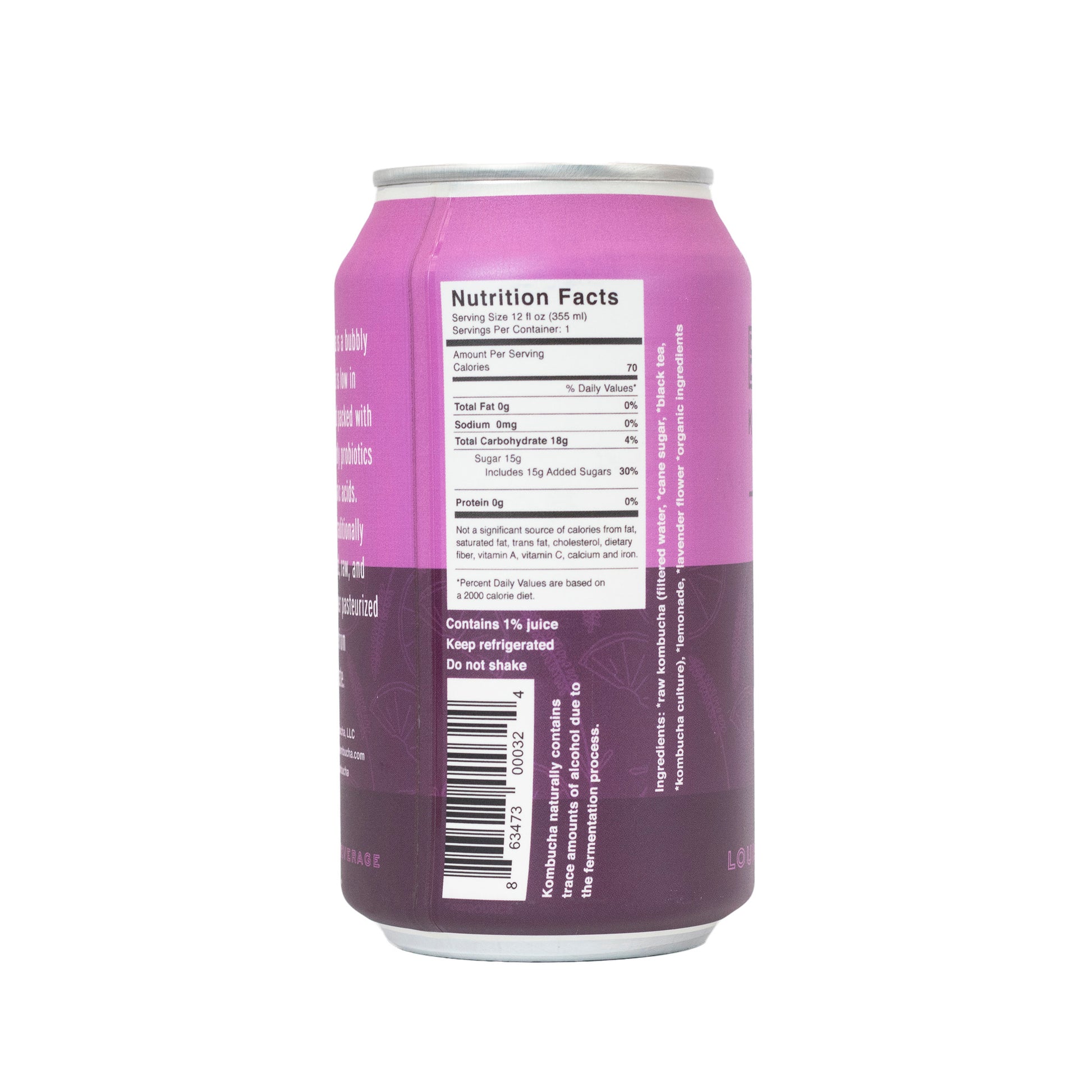Ingredients: organic raw kombucha (filtered water, organic cane sugar, organic black tea, organic kombucha culture), lemonade, organic lavender