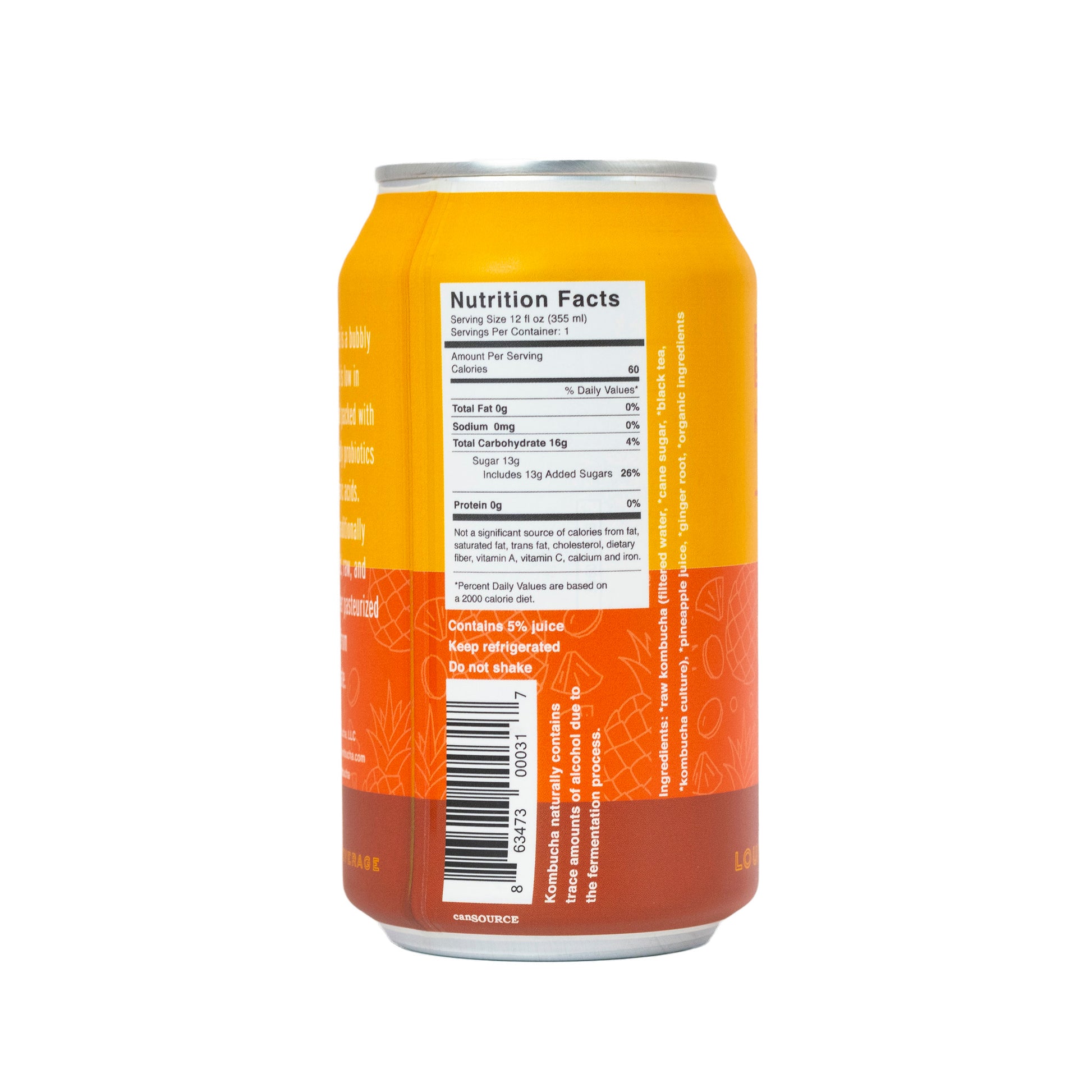 Ingredients: organic raw kombucha (filtered water, organic cane sugar, organic black tea, organic kombucha culture), pineapple juice, organic ginger juice